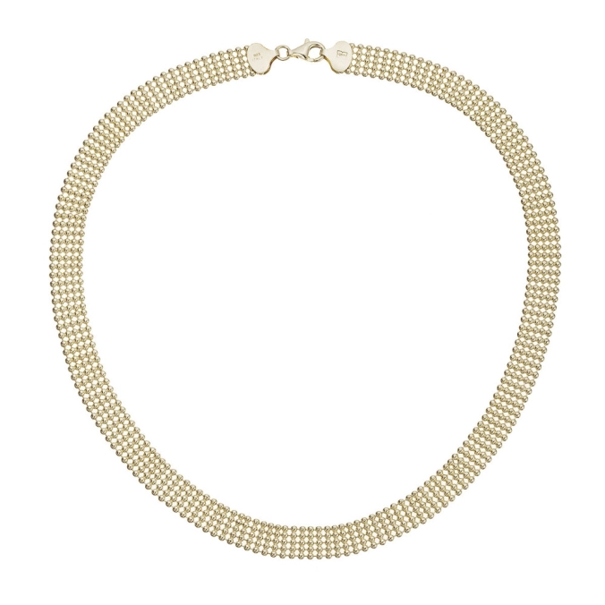 Náhrdelník z pozláteného striebra, kde sa päť hladkých línií drobných guličiek spojilo v jeden ucelený a elegantný celok . Vďaka pravidelnému usporiadaniu a decentnému lesku pôsobí jemne, ale zároveň pevne a výrazne.