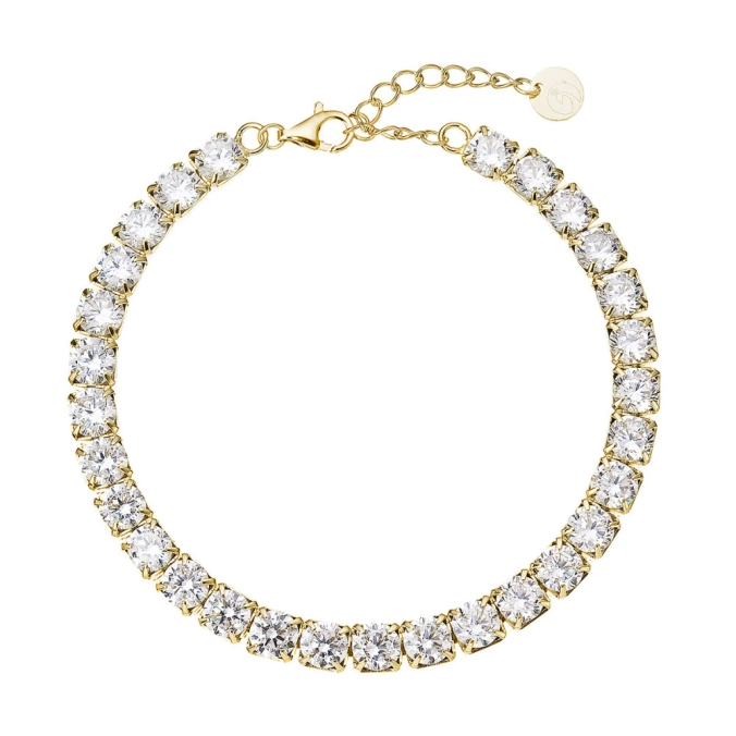 Luxusný tenisový náramok z pozláteného striebra osadený žiarivými zirkónmi predstavuje šperk, ktorý si hovorí o pozornosť. Jeho oslnivý lesk a precízne spracovanie z neho robí výnimočný doplnok pre slávnostné udalosti aj ako dar s veľkým významom. Každý zirkón je dokonale brúsený, výrazný a neprehliadnuteľný. Vďaka nastaviteľnej dĺžke perfektne padne na každé zápästie. Trblietavé zirkóny o veľkosti 5 mm sú vsadené do pozláteného striebra rýdzosti 925/1000.