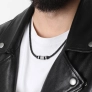 Elegantný pánsky náhrdelník vyrobený z čiernej recyklovanej kože, starostlivo zapletené do štýlového dizajnu. Náhrdelník je doplnený ozdobnými kovovými prvkami, ktoré dodávajú moderný a sofistikovaný vzhľad. Vďaka nastaviteľnej dĺžke 50+5 cm perfektne sedí a zaisťuje pohodlné nosenie. Ideálny doplnok pre mužov, ktorí ocenia štýl, udržateľnosť a precízne spracovanie.