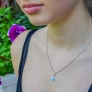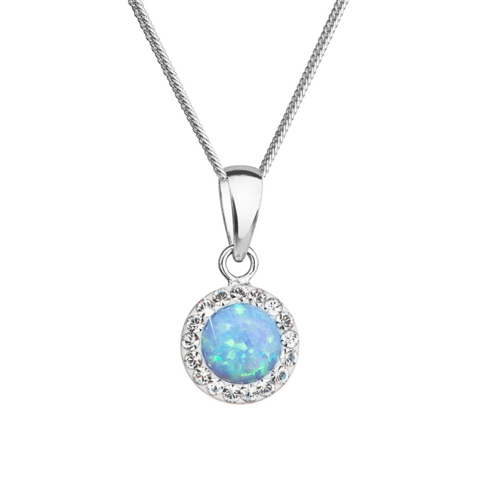 Náhrdelník obsahuje retiazku s okrúhlym príveskom. Šperk je vyrobený zo striebra rýdzosti 925/1000, ktoré prešlo povrchovou úpravou ródiom. Ródium chráni šperk proti sčerneniu, zožltnutiu i poškriabaniu. Prívesok je zdobený svetlo modrým syntetickým opálom , ktorý je navyše olemovaný malými trblietavými Preciosa kryštálmi v bielej farbe. Môžete si k nemu vybrať aj rovnaké náušnice so zapínaním na puzetu alebo skrutku. Keďže šperk neobsahuje žiadny prídavok niklu , môžu ho bez obáv nosiť aj alergici.