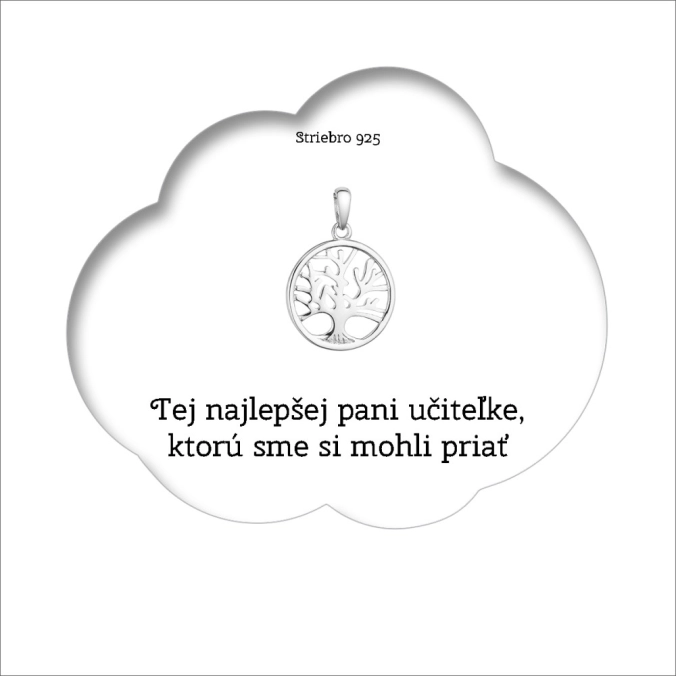 Darčekový set obsahuje strieborný prívesok strom života , ktorý je zavesený na darčekovej karte s nádherným prianím „Najlepšia pani učiteľke, ktorú sme si mohli priať“ .