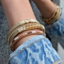 Elegantný široký náramok v jemne béžových tónoch prináša dokonale zladenú kombináciu štýlu a originality. Tvorený je niekoľkými semišovými pásikmi, ktoré sa spájajú do jedného pohodlného magnetického zapínania v zlatej farbe . Každý opasok nesie svoj jedinečný dekor – či už jemné korálky, štvorcovú mozaiku v prírodných farbách alebo trblietavé kryštály lemované zlatistou retiazkou z drobných guličiek.