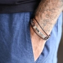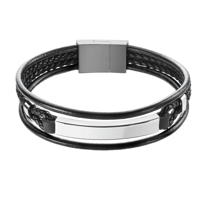 Veľmi populárny módny doplnok, vkusne doplní Váš outfit a pritiahne zaslúženú pozornosť. Pánsky náramok je vyrobený z rôzne tvarovaných pásikov z čiernej recyklovanej kože a koženky ozdobený oceľovým prvkom, ktorá upúta pozornosť okolia.