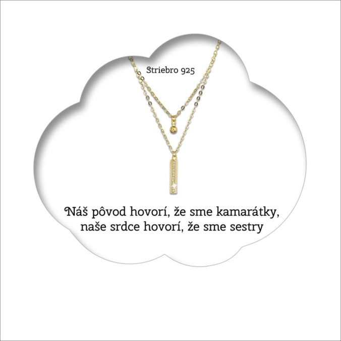 Darčekový set obsahuje pozlátený dvojradový strieborný náhrdelník gulička a úzky obdĺžnik so zirkónmi biely , ktorý je zavesený na darčekovej karte s nádherným prianím „Náš pôvod hovorí, že sme kamarátky, naše srdce hovorí, že sme sestry“. Krásny symbolický darček pre vašu kamarátku a najlepšiu priateľku, ktorá je vám blízka, ako vlastná sestra. Náhrdelník symbolizujúci okamihy, ktoré si chcete udržať v pamäti na nekonečne dlho.