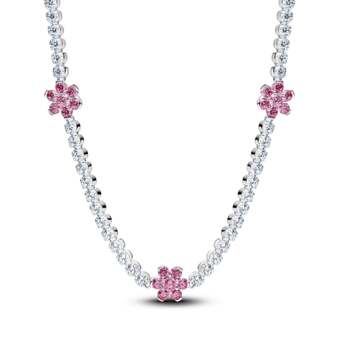 Pandora Strieborný choker s kvetinovým vzorom, ozdobným ružovým, čírym kubickým zirkónom a posuvnou sponou