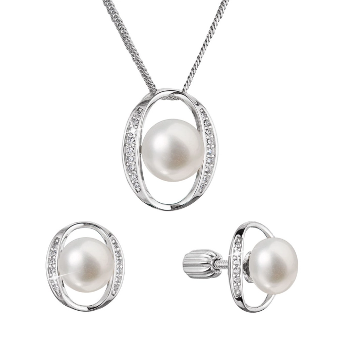 vyniká nádherná pravá perla , poskytujúca kontrast medzi jemnou eleganciou perly a iskrivým leskom zirkónov. Oválny tvar dodáva šperkom jemnú modernosť. Táto súprava je