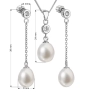 Ušľachtilá 3dielna súprava z bielych riečnych perál 29005.1 sa skladá z 39 mm dlhých visiacich náušníc , perlového prívesku a striebornej retiazky o dĺžke 45 cm. Šperky sú vyrobené zo striebra o rýdzosti 925/1000 s povrchovou úpravou ródiom, sú doplnené o luxusné riečne perly najvyššej kvality AAA a šmrnc im dodávajú blýskavé zirkóny, ktorými sú šperky vysadené. Originálna súprava šperkov neobsahuje žiadny nikel , a tak šperky môžu bez obáv nosiť aj alergici.