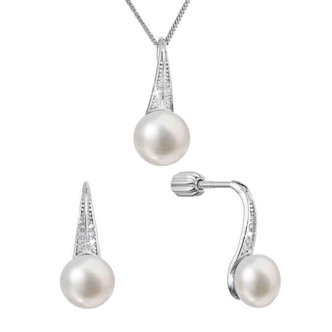 elegantný dizajn s jemným motívom bohato zdobeným zirkónmi. Pravá riečna perla visí nežne z dolnej časti , dodávajúc celkovému vzhľadu šarm a sofistikovanosť. Súprava je veľmi elegantná, ideálna na slávnostné príležitosti.