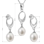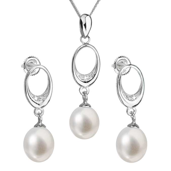Perlová súprava obsahuje visiace náušnice s dĺžkou 25 mm a 45 cm dlhý náhrdelník s perlovým príveskom. Šperky sú vyrobené zo striebra o rýdzosti 925/1000 s rhodiovanou povrchovou úpravou, sú vysadené niekoľkými blýskavými zirkónmi a zaujmú predovšetkým výraznú oválnu perlou , ktorá spadá do kategórie najvyššej kvality AAA . Súpravu šperkov môžu bez obáv nosiť aj alergici, neobsahuje totiž žiadny prídavok niklu . Náušnice sa zapínajú na skrutku , ktorá kvalitne ochráni šperk proti nechcenej strate.