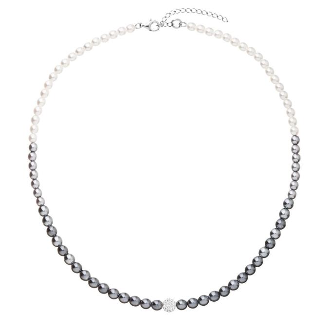 Perlový náhrdelník 32065.3 v dĺžke 45+5 cm je poskladaný zo šedých a bielych perál, medzi ktoré je navlečená gulička vysadená mnohými Preciosa kryštáliky v bielej farbe. Na zapínanie náhrdelníka bolo použité striebro rýdzosti 925/1000, ktoré prešlo úpravou ródiom. Ródium striebro ochráni proti sčernaniu, zožltnutiu i poškriabaniu. Náhrdelník je vhodný aj pre alergikov , neobsahuje totiž nikel.