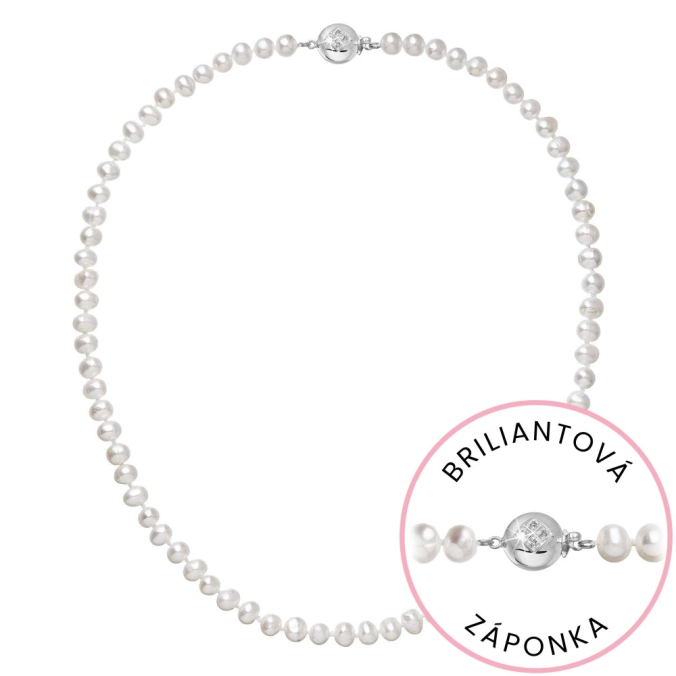 S náhrdelníkom z pravých sladkovodných kultivovaných riečnych perál budete v spoločnosti očarujúce! Jedinečný perlový náhrdelník 822001.1/9270B doplnený o zlaté 14-karátové zapínanie bude vo Vašom dekolte neprehliadnuteľný. Náhrdelník je navlečený z pravých riečnych perál vysokej kvality B a je zaistený uzlíkovou väzbou, ktorá zabraňuje posúvaniu a poškodeniu perál trením o seba a rovnako chráni perly pred rozsypaním, pokiaľ sa náhrdelník náhodou pretrhne. Zapínanie v tvare guličky ozdobené briliantmi o celkovej váhe 0,024 ct. je vyrobené zo zlata rýdzosti 585/1000 . Perlový náhrdelník so zlatým zapínaním pre Vás ručne vyrobili naše šikovné šperkárky, ktoré výrobe každého šperku venujú náležitú starostlivosť. O pravosti zlata, riečnych perál a briliantov Vás presvedčí certifikát pravosti, ktorý je ku šperku priložený. Náhrdelník Vám dodáme v originálnej krabičke spolu s darčekovou taštičkou, ktorú od nás obdržíte zadarmo.