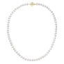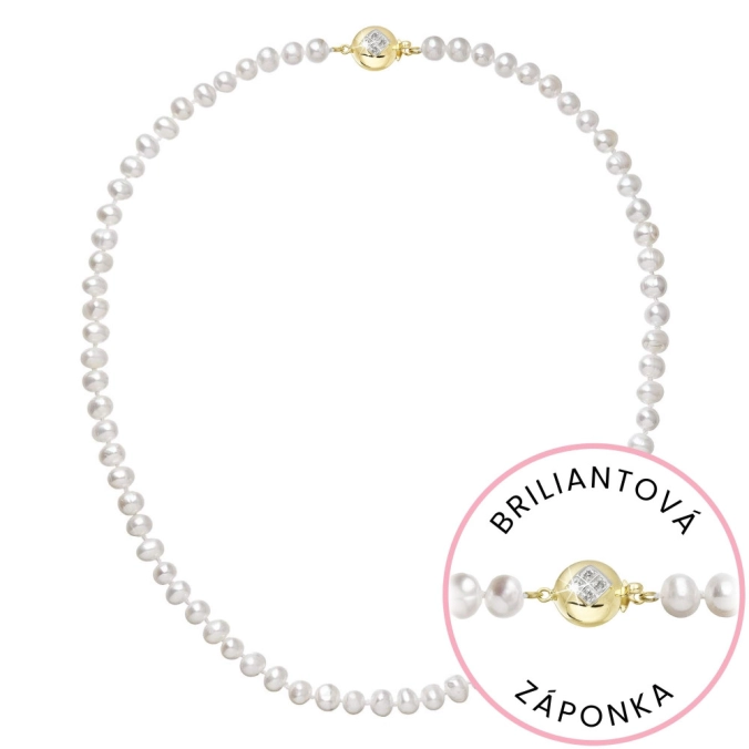 Jedinečný perlový náhrdelník 922001.1/9270A doplnený o zlaté 14-karátové zapínanie bude vo Vašom dekolte neprehliadnuteľný. Náhrdelník je navlečený z pravých riečnych perál vysokej kvality B a je zaistený uzlíkovou väzbou, ktorá zabraňuje posúvaniu a poškodeniu perál trením o seba a rovnako chráni perly pred rozsypaním, pokiaľ sa náhrdelník náhodou pretrhne. Zapínanie v tvare guličky ozdobené briliantmi o celkovej váhe 0,024 ct. je vyrobené z e zlata rýdzosti 585/1000 . Perlový náhrdelník so zlatým zapínaním pre Vás ručne vyrobili naše šikovné šperkárky, ktoré výrobe každého šperku venujú náležitú starostlivosť. O pravosti zlata, riečnych perál aj briliantov Vás presvedčí certifikát pravosti, ktorý je ku šperku priložený.