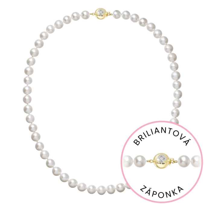 Jedinečný perlový náhrdelník 922003.1/9270A doplnený o zlaté 14-karátové zapínanie bude vo Vašom dekolte neprehliadnuteľný. Náhrdelník je navlečený z pravých riečnych perál vysokej kvality AA a je zaistený uzlíkovou väzbou, ktorá zabraňuje posúvaniu a poškodeniu perál trením o seba a rovnako chráni perly pred rozsypaním, pokiaľ sa náhrdelník náhodou pretrhne. Zapínanie v tvare guličky ozdobené briliantmi o celkovej váhe 0,024 ct. je vyrobené zo zlata rýdzosti 585/1000. Perlový náhrdelník so zlatým zapínaním pre Vás ručne vyrobili naše šikovné šperkárky, ktoré výrobe každého šperku venujú náležitú starostlivosť. O pravosti zlata, riečnych perál a briliantov Vás presvedčí certifikát pravosti, ktorý je ku šperku priložený.