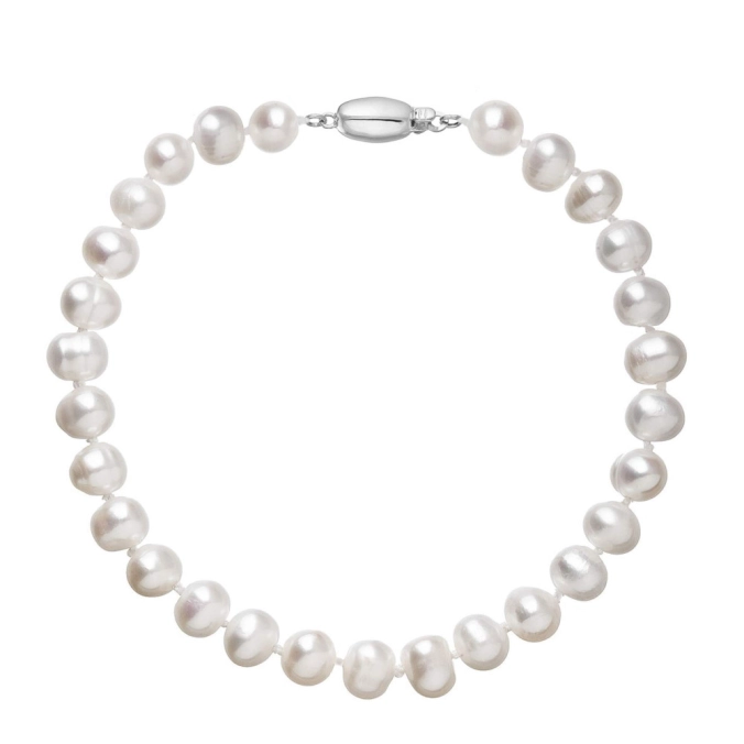 S náramkom z pravých sladkovodných kultivovaných riečnych perál budete v spoločnosti očarujúce! Jedinečný perlový náramok 823001.1/9271B doplnený o zlaté 14-karátové zapínanie bude vo Vašom dekolte neprehliadnuteľný. Náramok je navlečený z pravých riečnych perál vysokej kvality B a je zaistený uzlíkovou väzbou, ktorá zabraňuje posúvaniu a poškodeniu perál trením o seba a rovnako chráni perly pred rozsypaním, pokiaľ sa náramok náhodou pretrhne. Zapínanie v tvare oválku je vyrobené zo zlata rýdzosti 585/1000 . Perlový náramok so zlatým zapínaním pre Vás ručne vyrobili naše šikovné šperkárky, ktoré výrobe každého šperku venujú náležitú starostlivosť. O pravosti zlata a riečnych perál Vás presvedčí certifikát pravosti, ktorý je ku šperku priložený. Náramok Vám dodáme v originálnej krabičke spolu s darčekovou taštičkou, ktorú od nás obdržíte zadarmo.
