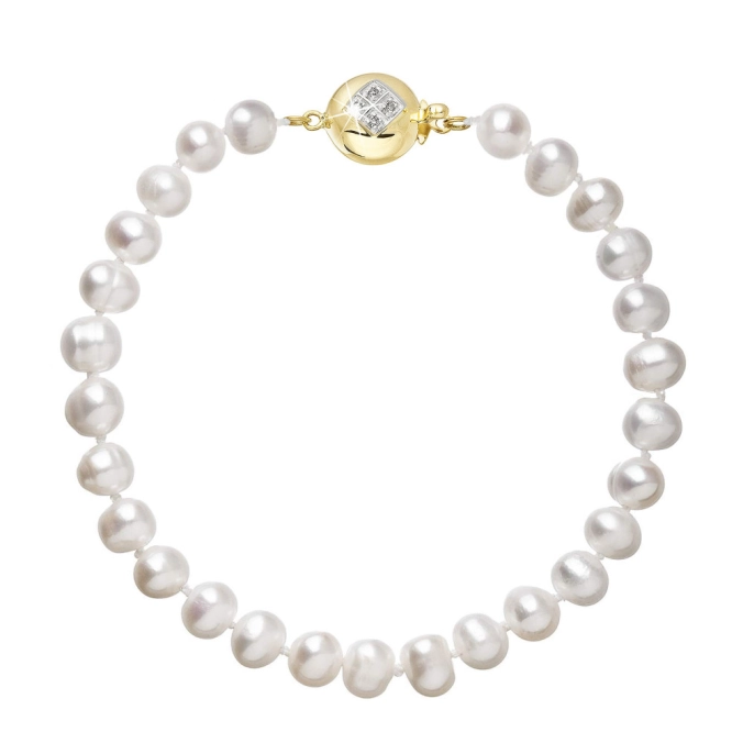 Jedinečný perlový náramok 923001.1/9270A doplnený o zlaté 14-karátové zapínanie bude vo Vašom dekolte neprehliadnuteľný. Náramok je navlečený z pravých riečnych perál vysokej kvality B a je zaistený uzlíkovou väzbou, ktorá zabraňuje posúvaniu a poškodeniu perál trením o seba a rovnako chráni perly pred rozsypaním, pokiaľ sa náramok náhodou pretrhne. Zapínanie v tvare guličky ozdobené briliantmi o celkovej váhe 0,024 ct. je vyrobené zo zlata rýdzosti 585/1000 . Perlový náramok so zlatým zapínaním pre Vás ručne vyrobili naše šikovné šperkárky, ktoré výrobe každého šperku venujú náležitú starostlivosť. O pravosti zlata, riečnych perál aj briliantov Vás presvedčí certifikát pravosti, ktorý je ku šperku priložený.