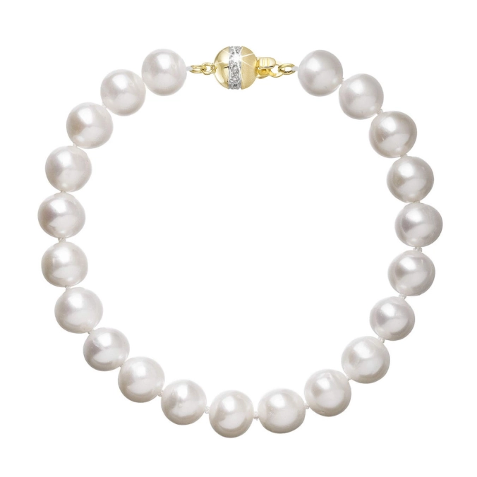 S náramkom z pravých sladkovodných kultivovaných riečnych perál budete v spoločnosti očarujúce! Jedinečný perlový náramok 923003.1/9266A doplnený o zlaté 14-karátové zapínanie bude vo Vašom dekolte neprehliadnuteľný. Náramok je navlečený z pravých riečnych perál vysokej kvality AA a je zaistený uzlíkovou väzbou, ktorá zabraňuje posúvaniu a poškodeniu perál trením o seba a rovnako chráni perly pred rozsypaním, pokiaľ sa náramok náhodou pretrhne. Zapínanie v tvare guličky ozdobené briliantmi o celkovej váhe 0,024 ct. je vyrobené zo zlata rýdzosti 585/1000 . Perlový náramok so zlatým zapínaním pre Vás ručne vyrobili naše šikovné šperkárky, ktoré výrobe každého šperku venujú náležitú starostlivosť. O pravosti zlata, riečnych perál a briliantov Vás presvedčí certifikát pravosti, ktorý je ku šperku priložený. Náramok Vám dodáme v originálnej krabičke spolu s darčekovou taštičkou, ktorú od nás obdržíte zadarmo.