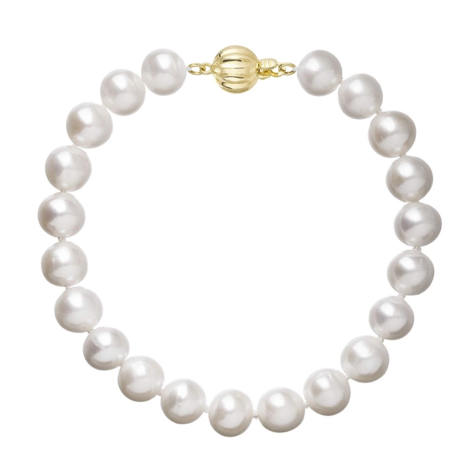S náramkom z pravých sladkovodných kultivovaných riečnych perál budete v spoločnosti očarujúce! Jedinečný perlový náramok 923003.1/9272A doplnený o zlaté 14karátové zapínanie bude vo Vašom dekolte neprehliadnuteľný. Náramok je navlečený z pravých riečnych perál vysokej kvality AA a je zaistený uzlíkovou väzbou, ktorá zabraňuje posúvaniu a poškodeniu perál trením o seba a rovnako chráni perly pred rozsypaním, pokiaľ sa náramok náhodou pretrhne. Zapínanie v tvare zdobenej guličky je vyrobené zo zlata rýdzosti 585/1000 . Perlový náramok so zlatým zapínaním pre Vás ručne vyrobili naše šikovné šperkárky, ktoré výrobe každého šperku venujú náležitú starostlivosť. O pravosti zlata a riečnych perál Vás presvedčí certifikát pravosti, ktorý je ku šperku priložený. Náramok Vám dodáme v originálnej krabičke spolu s darčekovou taštičkou, ktorú od nás obdržíte zadarmo.