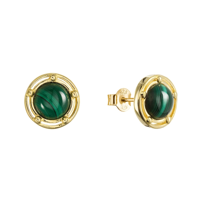 Náušnice sú vyrobené zo striebra rýdzosti 925/1000 s pozláteným povrchom, ktorý šperku dodáva nádych luxusu. Náušnice vás okúzlia svojou jemnou eleganciou a prirodzeným pôvabom. Ich unikátny dizajn tvorí okrúhly malachit v sýto zelenej farbe, ktorý je nežne objímaný jemným pozláteným okrajom. Tento kontrastný prvok vytvára harmonický celok, kde zelený kameň žiari uprostred ako drahocenný šperk. Klasický puzetový uzáver zaisťuje pohodlné a spoľahlivé nosenie.