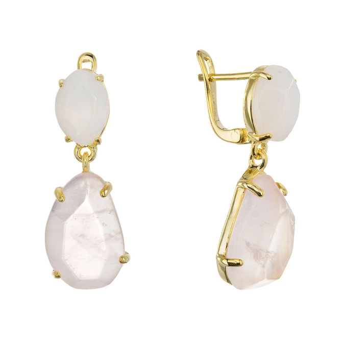 Náušnice sú vyrobené z pozláteného striebra najvyššej kvality rýdzosti 925/1000. Šperk zdobia dva vzácne kamene v nádhernom, takmer sochárskom prevedení - väčší, nežne ružový ruženín a menší, jemne modrošedý chalcedón. Ich vertikálne usporiadanie vytvára dynamickú kompozíciu plnú kontrastu a harmónie. Pozlátený povrch dodáva náušniciam teplý, jemný lesk, ktorý dokonale rozžaruje krásu kameňov. Pohodlné zapínanie na ruský patent zaručuje spoľahlivé a bezpečné nosenie.