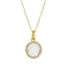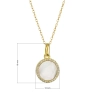 Náhrdelník je vytvorený z pozláteného striebra rýdzosti 925/1000. Zlatenie dodáva striebra romantický a teplý lesk. Dizajn šperku kombinuje čistotu a jemnosť - prírodná perleť v okrúhlom tvare je precízne zasadená do prívesku, ktorý vďaka svojmu jemnému bielemu lesku pripomína mesačný svit. Perleťový prívesok dodáva šperku nadčasovú eleganciu a jemný, takmer éterický vzhľad. Prívesok je navyše lemovaný drobnými trblietavými zirkónmi.