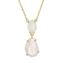 Náhrdelník s príveskom je vytvorený zo striebra rýdzosti 925/1000 s pozlátenou úpravou, ktorá dodáva šperku teplý a luxusný nádych. Precízne zasadené prírodné kamene - menší chalcedón a väčší ruženín - sú umiestnené vertikálne nad sebou a vytvárajú tak dynamickú kompozíciu. Ich jemné odtiene vytvárajú nežný, romantický dojem. Nepravidelné tvary kameňov podčiarkujú ich prirodzenú krásu a jedinečnosť - každý šperk je tak úplne originálny, rovnako ako každý okamih v prírode.