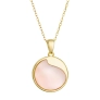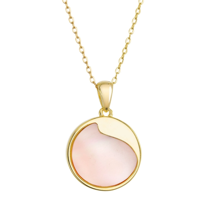 Náhrdelník s príveskom je vyrobený z pozláteného striebra tej najvyššej kvality 925/1000. Pozlátený povrch mu dodáva teplý, jemný lesk. Koliesko zdobené pravou ružovou perleťou je decentne ozvláštnené jemným strieborným výkrojom, ktorý dodáva šperku jedinečný charakter.