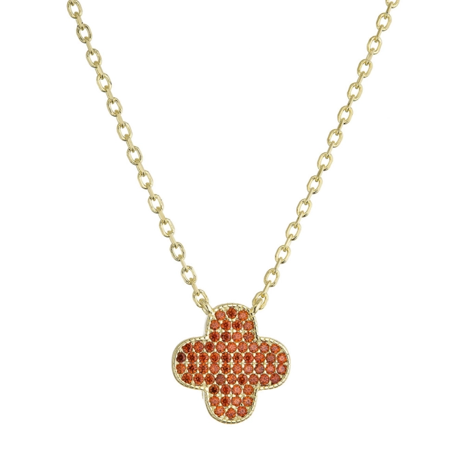 Náhrdelník je precízne spracovaný z pozláteného striebra rýdzosti 925/1000. Každý lístoček štvorlístka je starostlivo vysadený drobnými zirkónmi v oranžovej farbe, ktoré pri najmenšom pohybe rozohrávajú nádhernú hru svetla.