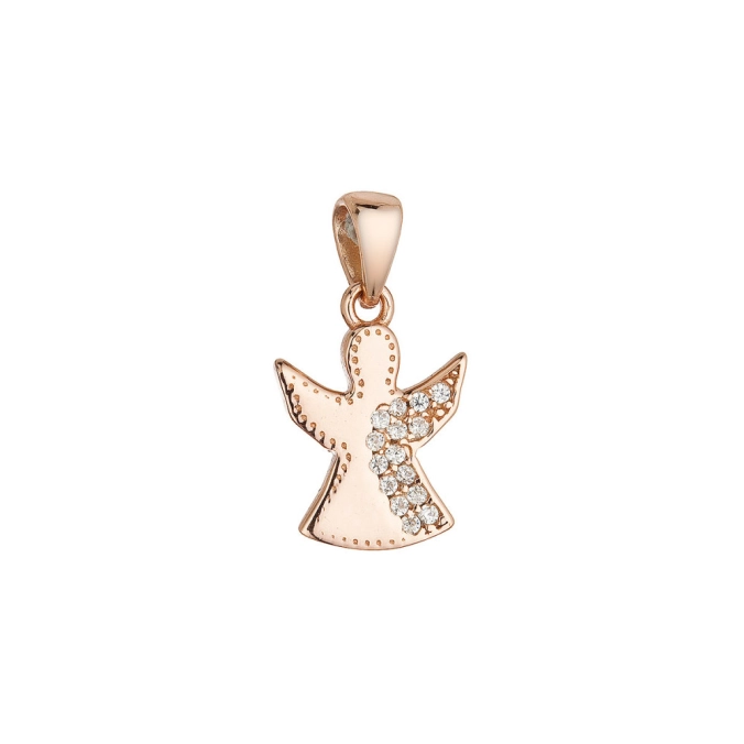 Prívesok je stvárnený ako silueta anjela s roztiahnutými krídlami, ktorá symbolizuje ochranu, duchovné vedenie a pokoj. Jeho obrys je jemne vykreslený drobným bodkovaným vzorom, čo dodáva šperku ručne opracovaný vzhľad . Stredom anjela sa vinie línia žiarivých čírych zirkónov , ktoré zachytávajú svetlo pri každom pohybe a prinášajú pocit výnimočnosti. Je vyrobený zo striebra o rýdzosti 925/1000 a je ružovo pozlátený.