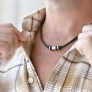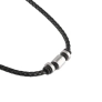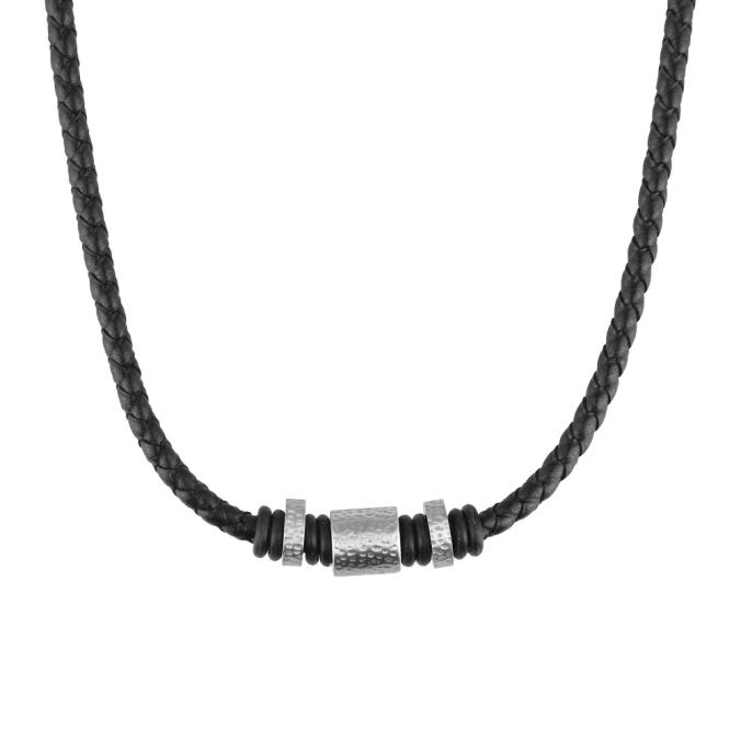 Elegantný pánsky náhrdelník vyrobený z čiernej recyklovanej kože, starostlivo zapletené do štýlového dizajnu. Náhrdelník je doplnený ozdobnými kovovými prvkami, ktoré dodávajú moderný a sofistikovaný vzhľad. Vďaka nastaviteľnej dĺžke 50+5 cm perfektne sedí a zaisťuje pohodlné nosenie. Ideálny doplnok pre mužov, ktorí ocenia štýl, udržateľnosť a precízne spracovanie.