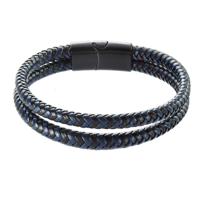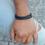 Náramok je vhodným darčekom pre elegantných mužov a je tvorený zapletenými koženkovými pásikmi do okrúhleho prierezu čiernej a tmavo modrej farby.