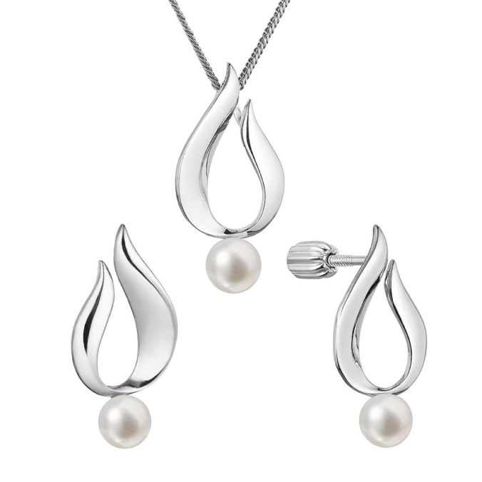 Strieborná súprava šperkov v podobe plamienkov prináša do vášho vzhľadu hru elegantných kriviek a prirodzenej krásy . Každý plamienok zdobí pravé riečne perly, dodávajúce šperkom dojem jemného luxusu.