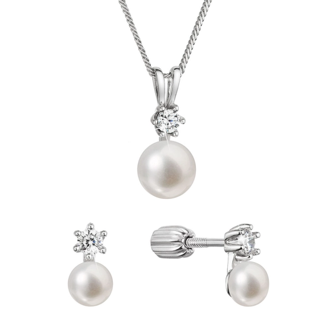 prívesok na striebornej retiazke . Sladkovodné perly, ktorými sú šperky zdobené, majú veľmi vysoký lesk, pretože spadajú do kategórie kvality