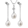 Ušľachtilá 3dielna súprava z bielych riečnych perál 29005.1 sa skladá z 39 mm dlhých visiacich náušníc , perlového prívesku a striebornej retiazky o dĺžke 45 cm. Šperky sú vyrobené zo striebra o rýdzosti 925/1000 s povrchovou úpravou ródiom, sú doplnené o luxusné riečne perly najvyššej kvality AAA a šmrnc im dodávajú blýskavé zirkóny, ktorými sú šperky vysadené. Originálna súprava šperkov neobsahuje žiadny nikel , a tak šperky môžu bez obáv nosiť aj alergici.