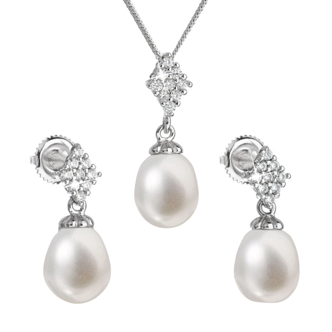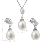Súprava šperkov obsahuje visiace náušnice s bielymi perlami a náhrdelník s oválnym perlovým príveskom. Perly, ktorými je súprava zdobená, spadajú do kategórie najvyššej kvality AAA . Luxusné perly dopĺňa striebro rýdzosti 925/1000 vetne povrchovej úpravy ródiom a malé blyštivé zirkóny. Náušnice zapnete na skrutku , ktorá ich ochráni proti nechcenej strate.