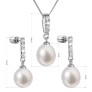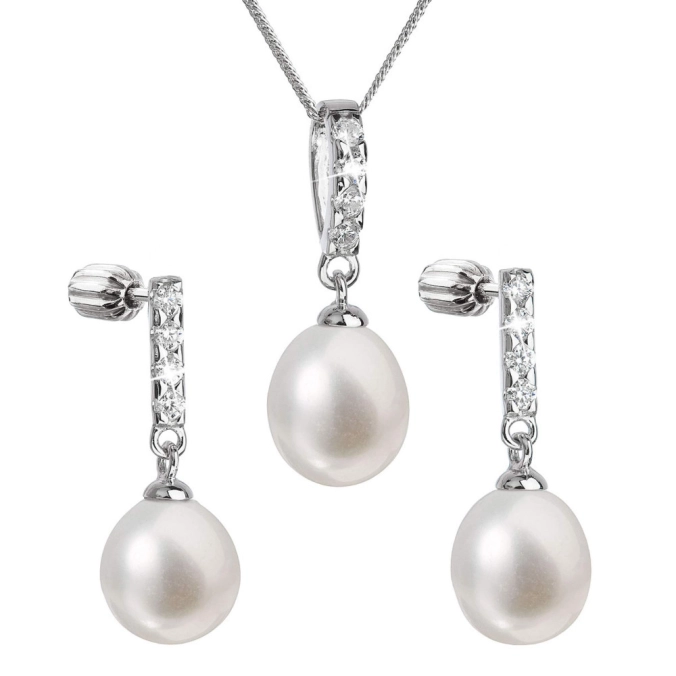Súprava z riečnych perál obsahuje slušivé visiace náušnice s dĺžkou 24 mm a perlový prívesok na striebornej retiazke. Sladkovodné perly, ktorými sú šperky zdobené, majú veľmi vysoký lesk, pretože spadajú do kategórie kvality AA . Šperky sú vyrobené zo striebra o rýdzosti 925/1000 vrátane povrchovej úpravy ródiom. Striebro je navyše ešte vysadené mnohými malými blyštivými zirkónmi , vďaka ktorým sa šperky krásne lesknú. Súpravu sa nemusia báť zaobstarať ani alergici, pretože šperky neobsahujú žiadny prídavok niklu. Náušnice zapnete na balónik, ktorý ich spoľahlivo ochráni proti nechcenej strate.