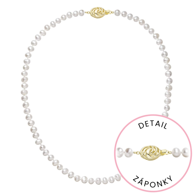 S náhrdelníkom z pravých sladkovodných kultivovaných riečnych perál budete v spoločnosti očarujúce! Jedinečný perlový náhrdelník 922001.1/9265A doplnený o zlaté 14-karátové zapínanie bude vo Vašom dekolte neprehliadnuteľný. Náhrdelník je navlečený z pravých riečnych perál vysokej kvality B a je zaistený uzlíkovou väzbou, ktorá zabraňuje posúvaniu a poškodeniu perál trením o seba a rovnako chráni perly pred rozsypaním, pokiaľ sa náhrdelník náhodou pretrhne. Zapínanie v tvare zdobeného oválku je vyrobené zo zlata rýdzosti 585/1000 . Perlový náhrdelník so zlatým zapínaním pre Vás ručne vyrobili naše šikovné šperkárky, ktoré výrobe každého šperku venujú náležitú starostlivosť. O pravosti zlata a riečnych perál Vás presvedčí certifikát pravosti, ktorý je ku šperku priložený. Náhrdelník Vám dodáme v originálnej krabičke spolu s darčekovou taštičkou, ktorú od nás obdržíte zadarmo.