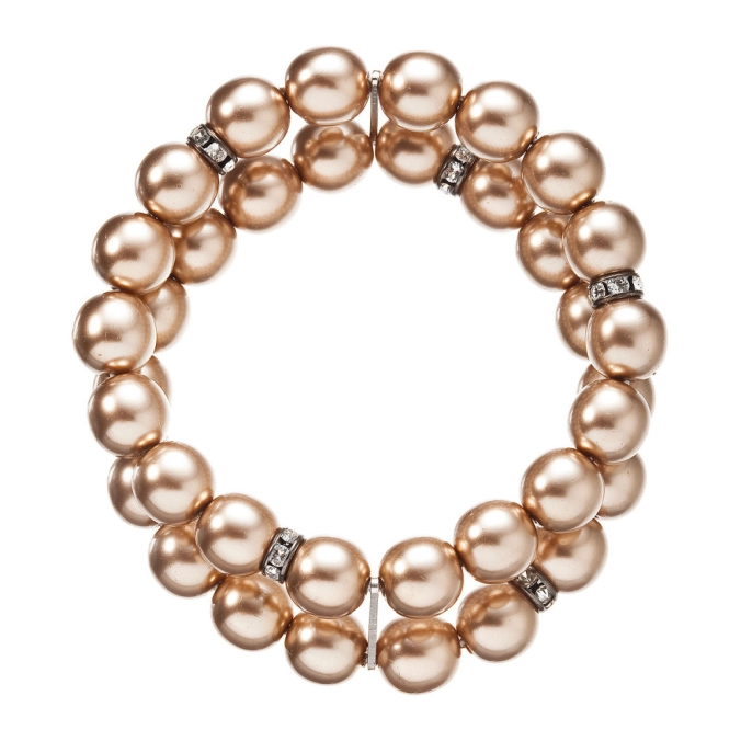Máte v obľube hnedé jesenné farby a chcete zvýrazniť svoj outfit? Ozdobte sa elegantným dvojradovým náramkom zo svetlo bronzových perál! Dvojradový náramok 33065.3 je zo svetlobronzových syntetických perál medzi ktoré sú vložené metal rondelky vysadené kryštálmi . Kryštály sú v bielej farbe. Oba náramky sú spojené jemným strieborným komponentom. Dĺžka náramku je 17,5 cm, je pružného materiálu a tak sa prispôsobí veľkosti zápästia. Na rondelky bol použitý bižutérny kov, ktorého povrch prešiel úpravou ródiom. Perlový náramok 33065.3 pre vás ručne vyrobili naše šikovné šperkárky. Náramok vám zadarmo pripravíme do darčekovej krabičky.
