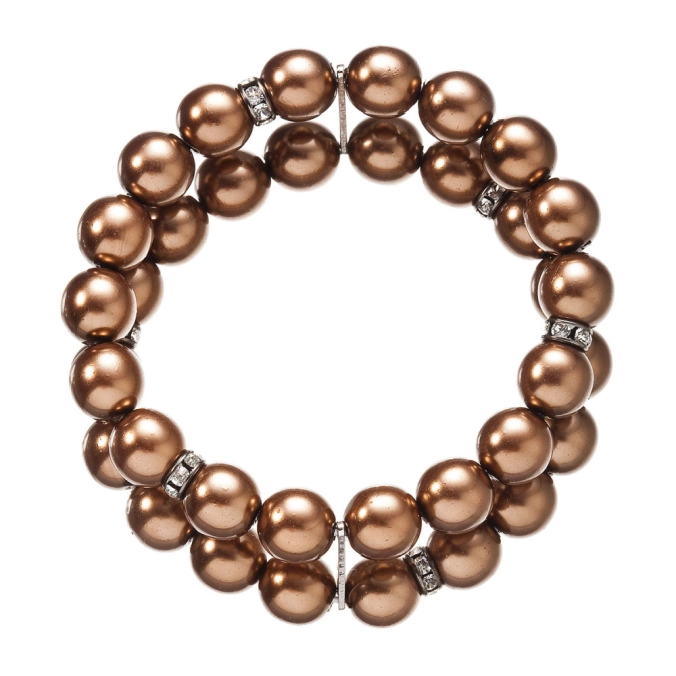 Chystáte sa na ples alebo na inú výnimočnú udalosť? Ozdobte sa elegantným dvojradovým náramkom z bronzových perál! Dvojradový náramok 33065.3 je z hnedých-bronzových syntetických perál medzi ktoré sú vložené metal rondelky vysadené kryštálmi . Kryštály sú v bielej farbe. Oba náramky sú spojené jemným strieborným komponentom. Dĺžka náramku je 17,5 cm, je pružného materiálu a tak sa prispôsobí veľkosti zápästia. Na rondelky bol použitý bižutérny kov, ktorého povrch prešiel úpravou ródiom. Perlový náramok 33065.3 pre vás ručne vyrobili naše šikovné šperkárky. Náramok vám zadarmo pripravíme do darčekovej krabičky.