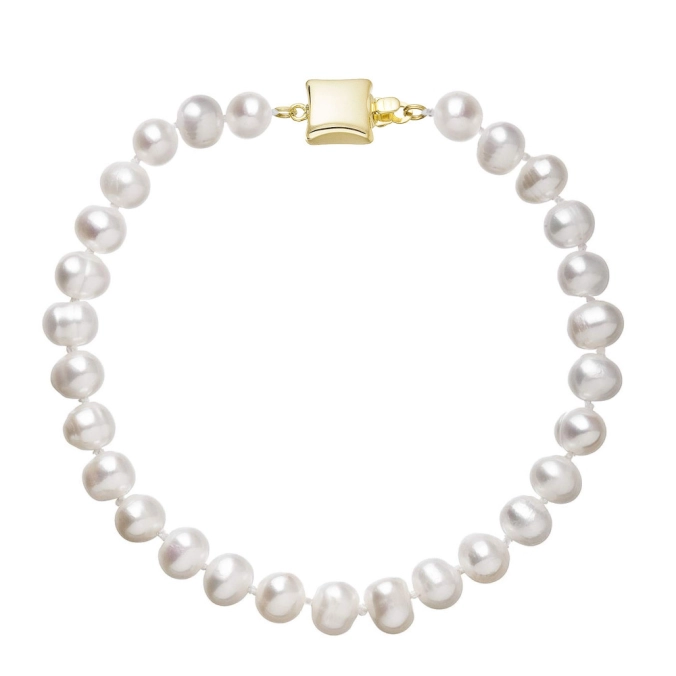 S náramkom z pravých sladkovodných kultivovaných riečnych perál budete v spoločnosti očarujúce! Jedinečný perlový náramok 923001.1/9268A doplnený o zlaté 14karátové zapínanie bude vo Vašom dekolte neprehliadnuteľný. Náramok je navlečený z pravých riečnych perál vysokej kvality B a je zaistený uzlíkovou väzbou, ktorá zabraňuje posúvaniu a poškodeniu perál trením o seba a rovnako chráni perly pred rozsypaním, pokiaľ sa náramok náhodou pretrhne. Zapínanie v tvare štvorca je vyrobené zo zlata rýdzosti 585/1000 . Perlový náramok so zlatým zapínaním pre Vás ručne vyrobili naše šikovné šperkárky, ktoré výrobe každého šperku venujú náležitú starostlivosť. O pravosti zlata a riečnych perál Vás presvedčí certifikát pravosti, ktorý je ku šperku priložený. Náramok Vám dodáme v originálnej krabičke spolu s darčekovou taštičkou, ktorú od nás obdržíte zadarmo.
