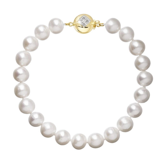 S náramkom z pravých sladkovodných kultivovaných riečnych perál budete v spoločnosti očarujúce! Jedinečný perlový náramok 923003.1/9270A doplnený o zlaté 14-karátové zapínanie bude vo Vašom dekolte neprehliadnuteľný. Náramok je navlečený z pravých riečnych perál vysokej kvality AA a je zaistený uzlíkovou väzbou, ktorá zabraňuje posúvaniu a poškodeniu perál trením o seba a rovnako chráni perly pred rozsypaním, pokiaľ sa náramok náhodou pretrhne. Zapínanie v tvare guličky ozdobené briliantmi o celkovej váhe 0,024 ct. je vyrobené zo zlata rýdzosti 585/1000 . Perlový náramok so zlatým zapínaním pre Vás ručne vyrobili naše šikovné šperkárky, ktoré výrobe každého šperku venujú náležitú starostlivosť. O pravosti zlata, riečnych perál a briliantov Vás presvedčí certifikát pravosti, ktorý je ku šperku priložený. Náramok Vám dodáme v originálnej krabičke spolu s darčekovou taštičkou, ktorú od nás obdržíte zadarmo.