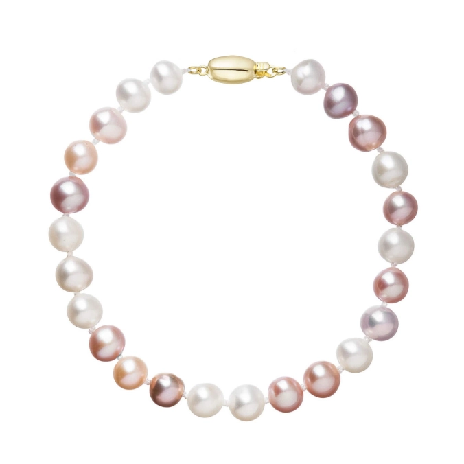 S náramkom z pravých sladkovodných kultivovaných riečnych perál budete v spoločnosti očarujúce! Jedinečný perlový náramok 923004.3/9272A doplnený o zlaté 14-karátové zapínanie bude vo Vašom dekolte neprehliadnuteľný. Náramok je navlečený z pravých riečnych perál vysokej kvality A a je zaistený uzlíkovou väzbou, ktorá zabraňuje posúvaniu a poškodeniu perál trením o seba a rovnako chráni perly pred rozsypaním, pokiaľ sa náramok náhodou pretrhne. Zapínanie v tvare zdobenej guličky je vyrobené zo zlata rýdzosti 585/1000 . Perlový náramok so zlatým zapínaním pre Vás ručne vyrobili naše šikovné šperkárky, ktoré výrobe každého šperku venujú náležitú starostlivosť. O pravosti zlata a riečnych perál Vás presvedčí certifikát pravosti, ktorý je ku šperku priložený. Náramok Vám dodáme v originálnej krabičke spolu s darčekovou taštičkou, ktorú od nás obdržíte zadarmo.