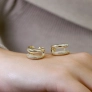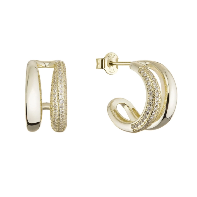 Pozlátené náušnice s dvojitými kruhmi ponúkajú elegantný dizajn, ktorý kombinuje hladkú a zirkónmi vysadenú časť. Tento kontrast vytvára harmóniu medzi jednoduchosťou a luxusom.