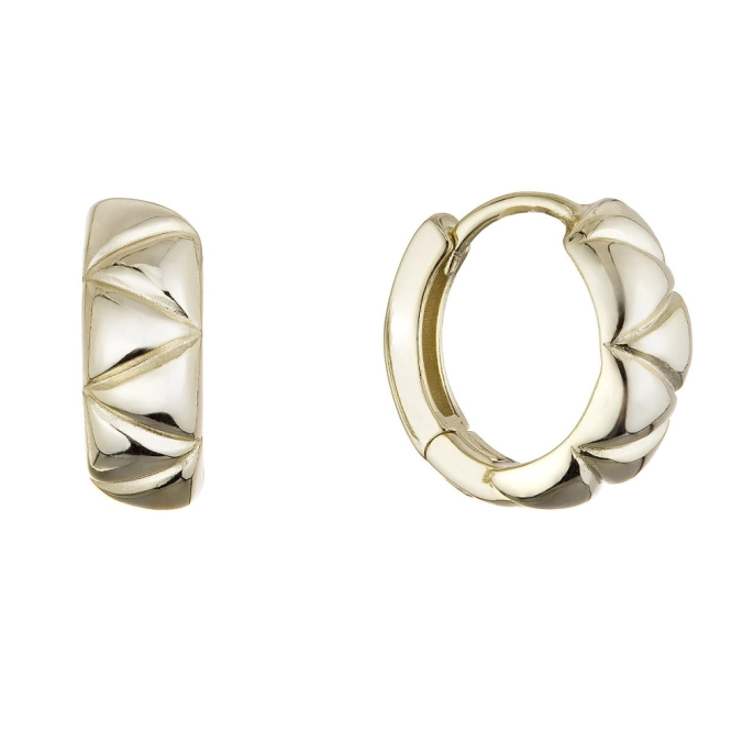 Pozlátené náušnice kruhy 61157 zaujmú svojim plasticky tvarovaným povrchom . Jemné trojuholníkovité segmenty vytvárajú decentný reliéf , ktorý dodáva náušniciam unikátny vzhľad.