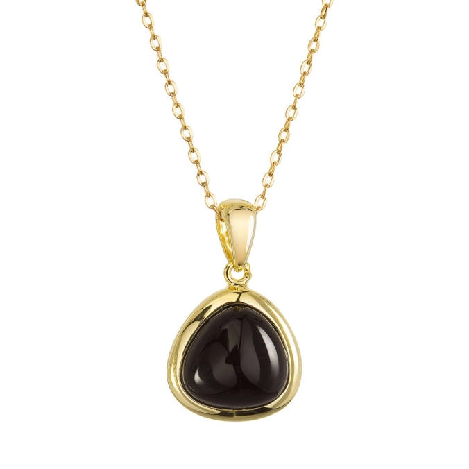 Náhrdelník je vyrobený zo striebra rýdzosti 925/1000 s pozlátenou úpravou, ktorá dodáva šperku teplý, zlatistý lesk a jedinečný vzhľad. Precízne zasadený prírodný onyx s charakteristickou hlbokou čiernou farbou zapĺňa trojuholníkový prívesok, ktorý pripomína fragment tajomnej a nepriepustnej noci. Jemná linka pozláteného striebra lemujúca kameň vytvára harmonický celok, ktorý zachytáva mystickú hĺbku čiernej farby v jedinom okamihu.
