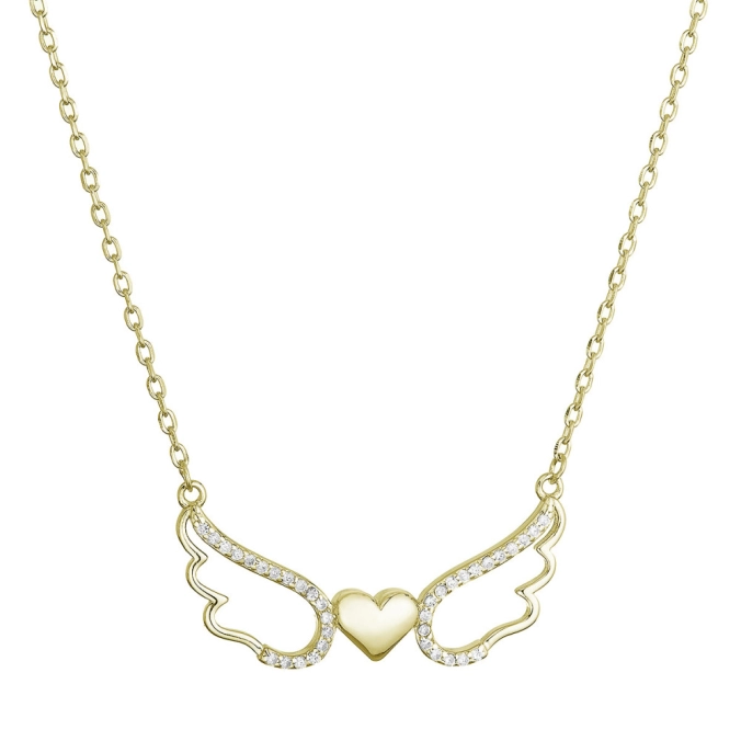 Anjelský náhrdelník s krídlami a srdcom - jemný šperk, ktorý symbolizuje nehu, ochranu a vnútornú silu. Viac ako obyčajný módny doplnok, je to osobný sprievodca vašou láskou a nádejou. Precízne spracovaný dizajn anjelských krídiel a srdca v pozlátenom striebre kombinuje nehu anjelskej ochrany s krehkosťou ľudských citov.